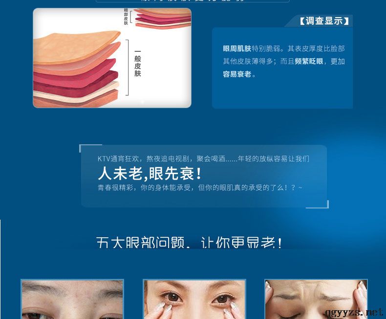 | 補充說明 | 1、眼部皮膚極薄,用得太多不但不能吸收,相反更會造成負擔加速衰老還會造成脂肪粒。 2、.眼霜應(yīng)該早晚都用,不能用面霜覆蓋眼霜。 3、同時涂抹眼霜時注意手的衛(wèi)生,避免2次污染,尤其是指甲縫要清洗干凈。 4、不能用面霜代替眼霜,面霜和乳液也應(yīng)該避開眼部使用 |