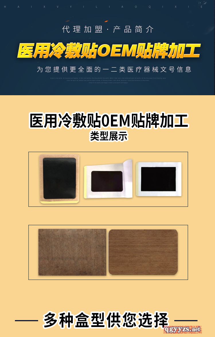 - 海旭醫(yī)療主要承接各類暖宮貼定制、遠(yuǎn)紅外理療貼代加工、磁療貼貼牌加工、穴位敷貼廠家、灸熱貼代加工、退熱貼代加工、燙熨治療包定制、小兒咳 喘腹瀉膏藥定制加工、艾灸貼定制、化妝品定制、保健食品定制、噴劑、乳膏類加 工等醫(yī)院臨床和終端診所所需的系列產(chǎn)品。公司的經(jīng)營范圍有:骨科,婦科、男科、手術(shù)科、五官科和小兒科等。