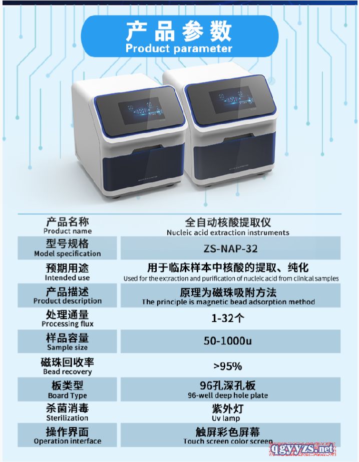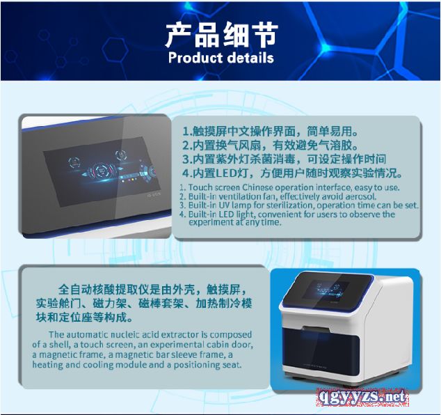 | 使用方法 | 詳情請見說明書。全自動核酸提取儀是由外殼,觸摸屏,實驗艙門、磁力架、磁棒套架、加熱制冷模塊和定位座等構(gòu)成。 |