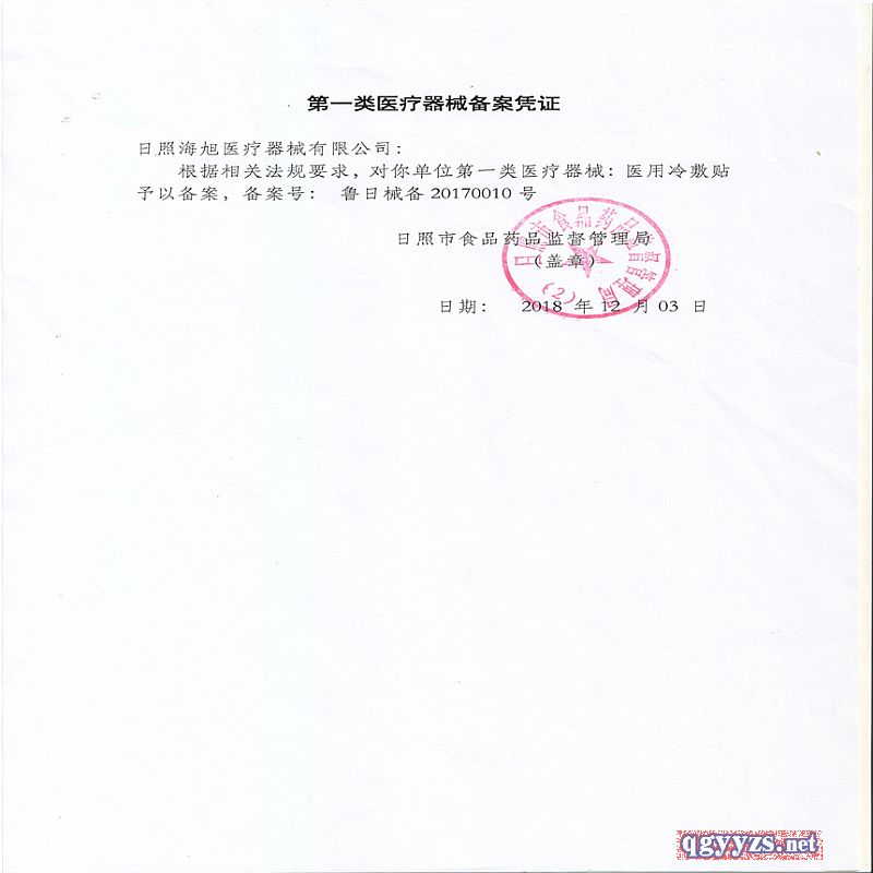 | 其它說明 | 日照海旭醫(yī)療器械有限公司是一家集新藥研發(fā)、貼膏制造與銷售于一體的大型企業(yè),專注外用貼膏貼 劑產(chǎn)品 14 年。是山東*大的貼膏生產(chǎn)廠家,全國(guó)*大醫(yī)藥生產(chǎn)基地,在全國(guó)貼膏企業(yè)中享譽(yù)盛名,集團(tuán)先 后獲得菏澤市高新技術(shù)企業(yè)、山東省質(zhì)量誠(chéng)信 AAA 級(jí)品牌企業(yè)、全國(guó)消費(fèi)者信得過 AAA 級(jí)品牌企業(yè)、 全國(guó)誠(chéng)信示范單位等多項(xiàng)榮譽(yù)。秉承“專業(yè),專心,專注”的經(jīng)營(yíng)理念,在保障人民健康和促進(jìn)行業(yè)發(fā)展 中發(fā)揮著越來越重要的作用。 |