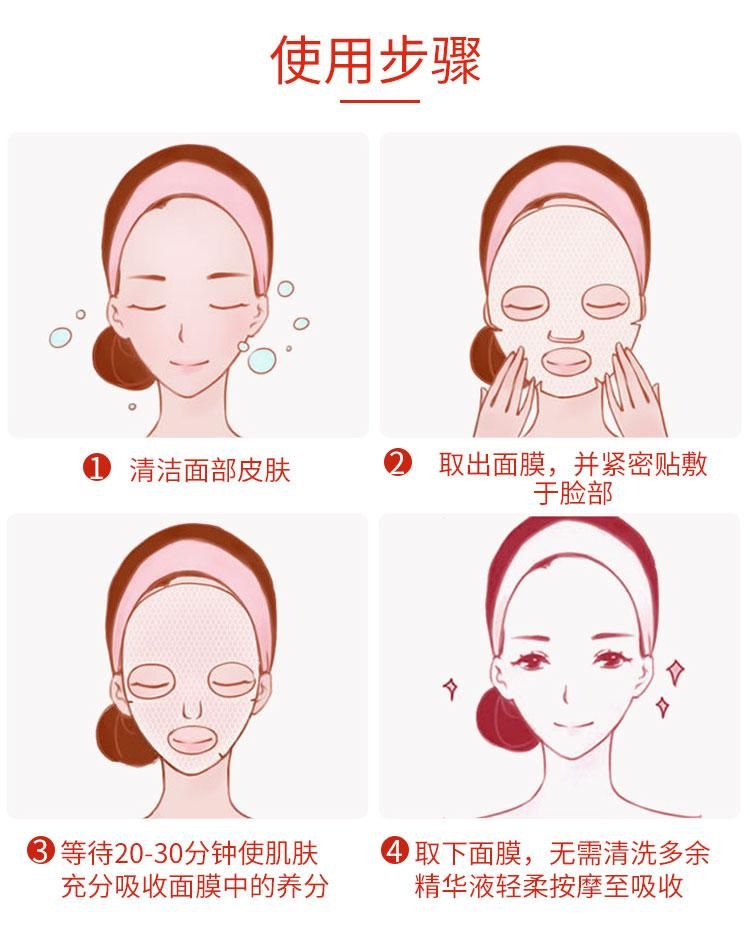 | 使用方法 | 1、面部清潔后,取出面膜。 2將面膜輕敷于全臉,約20-30分鐘后取下。 3、將剩余面膜液輕輕按摩至皮膚吸收。 4、使用后請(qǐng)拋棄,每天使用效果最佳。 |