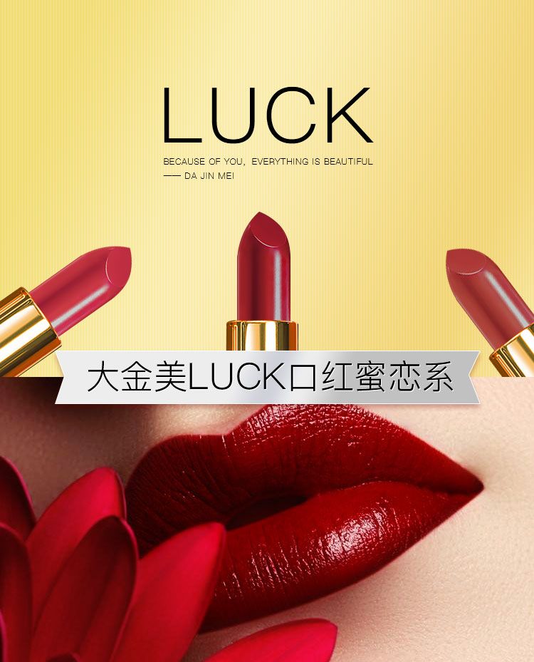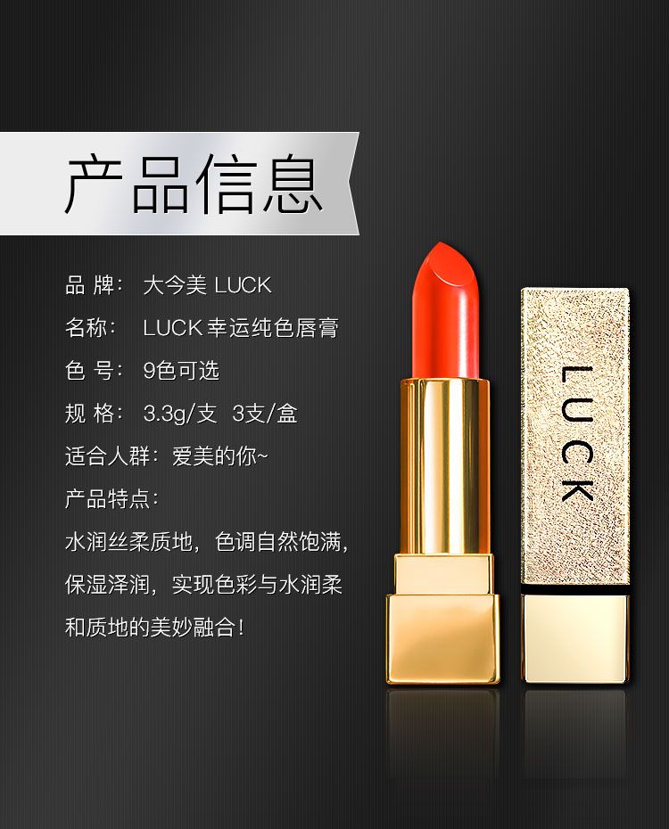 | 產(chǎn)品用途 | 千面女人多色詮釋 大金美LUCK口紅女王系 大金美LUCK口紅摯愛系 大金美LUCK口紅蜜戀系 產(chǎn)品信息 品牌:大今美LUCK 名稱: LUCK幸運純色唇膏 色號:9色可選 規(guī)格:3.3g/支3支/盒 適合人群:愛美的你~ 產(chǎn)品特點: 水潤絲柔質(zhì)地,色調(diào)自然飽滿,保濕澤潤,實現(xiàn)色彩與水潤柔和質(zhì)地的美妙融合! |