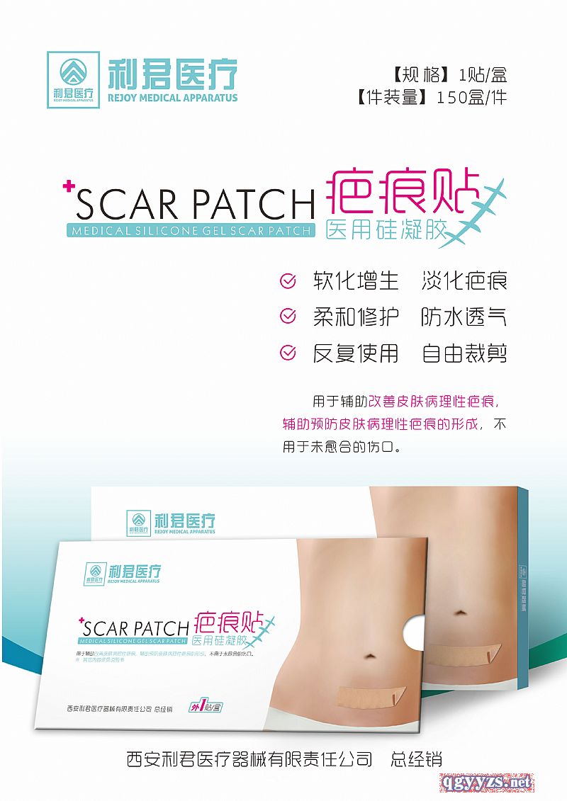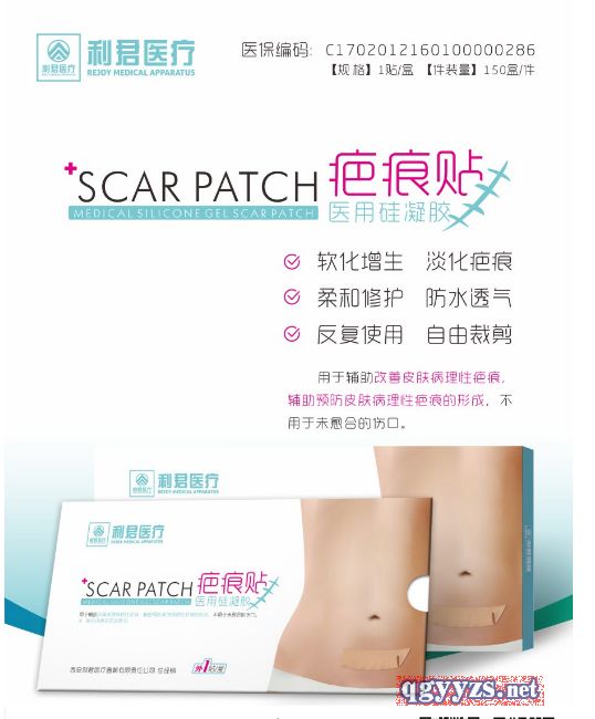 | 補充說明 | 【結(jié)構(gòu)性能】產(chǎn)品由醫(yī)用硅凝膠、硅橡膠膜和隔離層組成,隔離層由聚丙烯制成。水蒸汽透過≥2.2g/m2•24小時、粘著力≥0.2N/20mm、拉斷伸長率≥250%、拉伸強度應(yīng)≥0.7MPa、可伸展性≤4N/cm、**變形≤5%。 【適用范圍】減輕由剖腹產(chǎn)、燒傷或外傷引起的增生性疤痕,不適用于陳舊性疤痕。 【注意事項】1、本品必須在傷口結(jié)痂脫離,傷口愈合完好后使用;2、過敏暫停使用。 【禁忌癥】1、傷口未愈合者禁用;2、對硅橡膠類有皮膚過敏史者慎用。 【使用說明】1、在傷口愈合七天以后,開始使用本產(chǎn)品。2、前兩天,每天應(yīng)該只使用4小時;接下去的兩天,每天可延長至8小時;當(dāng)皮膚適應(yīng)后,每日可增加4小時,必須每日使用*少12小時,方能達至*佳效果。3、本產(chǎn)品單次使用應(yīng)小于24小時,可多次使用。4、治療增生性疤痕越早使用本產(chǎn)品越好。 【使用步驟】 1、使用前先將疤痕部位清洗干凈或用棉簽蘸取75%的酒精擦拭消毒,晾干;2、打開包裝,取出疤痕貼;3、使用時,傷疤一定是干燥的,避免傷疤處濕潤;4、去掉隔離層,將有粘性的一面貼在疤痕處,緊密貼敷;5、盡可能一天24小時都貼住,洗澡或是看傷疤*好一天一次為限。 |