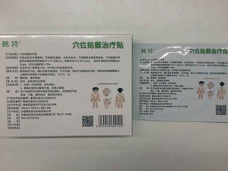 | 補(bǔ)充說(shuō)明 | [主要結(jié)構(gòu)]本品由遠(yuǎn)紅外陶瓷粉、丙烯酸壓敏膠、水刺無(wú)紡布、不銹鋼珠及離型紙制成。穴位貼敷治療貼的壓敏膠布剝離強(qiáng)度不小于1.0N/cm,持粘性應(yīng)不大于2.5mm,遠(yuǎn)紅外發(fā)射波長(zhǎng)范圍8μum-15μm,法向比輻射率> 75%。 [適用范圍]本品針對(duì)人體特定穴位,對(duì)中醫(yī)穴位起刺激作用。 [使用方法]清潔相應(yīng)穴位,確認(rèn)包裝無(wú)破損后,打開(kāi)包裝,取出穴位貼敷治療貼,將貼劑的隔離膜撕去,以鋼珠對(duì)準(zhǔn)相應(yīng)穴位敏感點(diǎn)貼壓,1片/穴、天。 [慎 用]糖尿病、高熱患者。 [禁忌癥]孕婦、皮膚潰爛處禁用。 [注意事項(xiàng)] 1、僅限一次性使用,用后銷(xiāo)毀;2、敷貼后如有過(guò)敏等不適,應(yīng)停止敷貼。 [貯 存]本產(chǎn)品應(yīng)貯存在相對(duì)濕度不超過(guò)80%,無(wú)腐蝕性氣體、陰涼、干燥、通風(fēng)良好、清潔的環(huán)境內(nèi)。 [產(chǎn)品技術(shù)要求編號(hào)]魯械注準(zhǔn)20152260316 [注冊(cè)證編號(hào)]魯械注準(zhǔn)20152260316 [生產(chǎn)許可證]魯食藥監(jiān)械生產(chǎn)許20130128號(hào) [型號(hào)規(guī)格] 70mm X 70mmX2貼X2袋 [生產(chǎn)單位]濟(jì)南康民藥業(yè)科技有限公司 [地 址]單縣經(jīng)濟(jì)技術(shù)開(kāi) 發(fā)區(qū)南樊路1號(hào)廠房101-109室 |