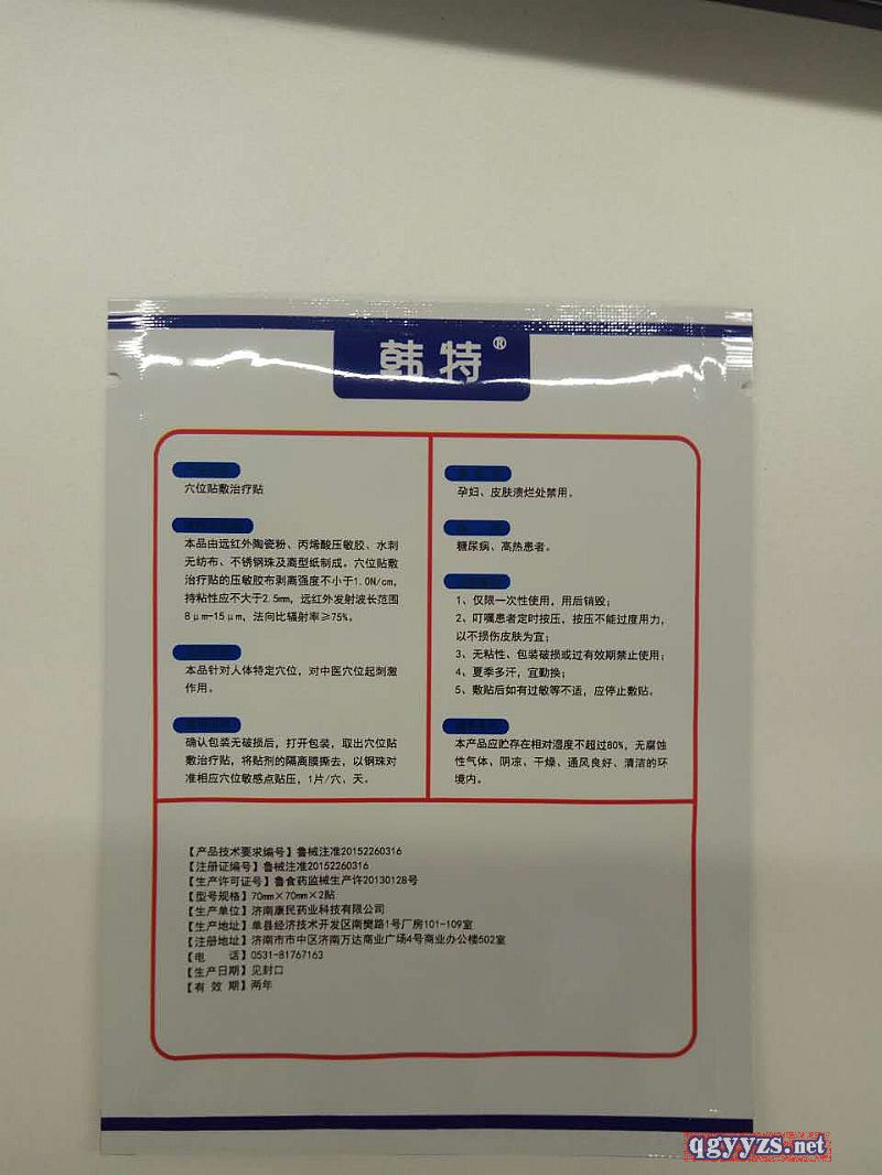 | 產(chǎn)品用途 | [產(chǎn)品名稱]穴位貼敷治療貼 [主要結(jié)構(gòu)]本品由遠(yuǎn)紅外陶瓷粉、丙烯酸壓敏膠、水刺無紡布、不銹鋼珠及離型紙制成。穴位貼敷治療貼的壓敏膠布剝離強(qiáng)度不小于1.0N/cm,持粘性應(yīng)不大于2.5mm,遠(yuǎn)紅外發(fā)射波長范圍8μum-15μm,法向比輻射率>75%。 [適用范圍]本品針對人體特定穴位,對中醫(yī)穴位起刺激作用。 [使用方法]清潔相應(yīng)穴位,確認(rèn)包裝無破損后,打開包裝,取出穴位貼敷治療貼,將貼劑的隔離膜撕去,以鋼珠對準(zhǔn)相應(yīng)穴位敏感點(diǎn)貼壓,1片/穴、天。 [慎用]糖尿病、高熱患者。 [禁忌癥]孕婦、皮膚潰爛處禁用。 |