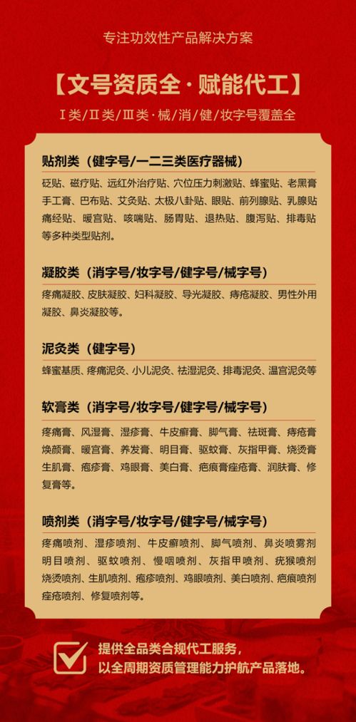 | 補(bǔ)充說明 | 注意事項:1市場大:膏藥的空白市場很大, 消費群體廣大。每個人都可能用到膏藥,并且有嚴(yán)格的區(qū)域保護(hù)。 2經(jīng)營活:可以自己在電商、微信上賣,可以做直播、短視頻,也可以和各大醫(yī)院、藥店、美容店合作。 3品種多:膏藥有:骨科、兒科、婦科、癥狀類等;瘖y品有面膜、精華液、水乳霜、彩妝、套盒、洗沐護(hù)等。 4操作易:專業(yè)的客服團(tuán)隊每月定期回訪,根據(jù)不同市場提供指導(dǎo)、培訓(xùn)、廣告、促銷活動支持! 貯藏:干燥陰涼 禁忌:無 保質(zhì)期:兩年 備注:1、優(yōu)質(zhì)服務(wù):專業(yè)OEM服務(wù)團(tuán)隊一對一服務(wù),從設(shè)計到出貨全程專人跟進(jìn)。 2、出貨迅速:包裝定稿,專業(yè)生產(chǎn)團(tuán)隊可在10—15天內(nèi)交付發(fā)貨。 3、質(zhì)量**:從生產(chǎn)至出廠五道質(zhì)檢嚴(yán)格把關(guān),全自動四邊封口機(jī)器密封性更好,產(chǎn)品更美觀 4、權(quán)威認(rèn)證:國家FDA認(rèn)證的一類醫(yī)療器械文號,藥監(jiān)局可查,十萬級凈化標(biāo)準(zhǔn)生產(chǎn)車間,品質(zhì)有**。 5、經(jīng)驗豐富:20年生產(chǎn)加工經(jīng)驗,已為上百個品牌提供服務(wù),產(chǎn)品已出口多個國家和地區(qū)。 6、產(chǎn)量充足:現(xiàn)代化生產(chǎn)車間、進(jìn)口全自動生產(chǎn)線,日產(chǎn)量100萬片。 7、品類齊全:300多款成熟配方(妝字號、械字號、消字號)免費打樣 |