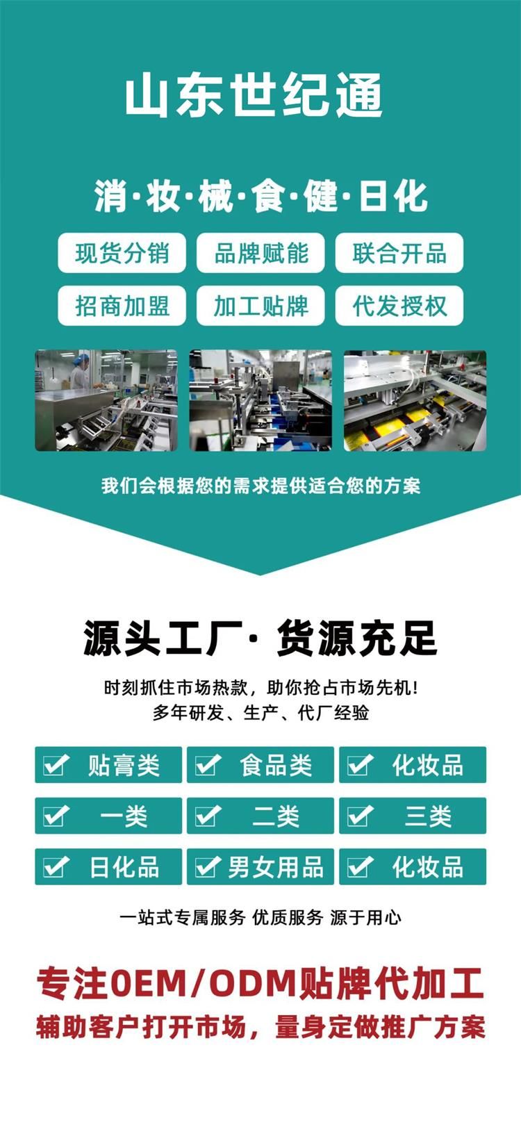 | 補充說明 | 注意事項:1市場大:膏藥的空白市場很大, 消費群體廣大。每個人都可能用到膏藥,并且有嚴格的區(qū)域保護。 2經(jīng)營活:可以自己在電商、微信上賣,可以做直播、短視頻,也可以和各大醫(yī)院、藥店、美容店合作。 3品種多:膏藥有:骨科、兒科、婦科、癥狀類等;瘖y品有面膜、精華液、水乳霜、彩妝、套盒、洗沐護等。 4操作易:專業(yè)的客服團隊每月定期回訪,根據(jù)不同市場提供指導、培訓、廣告、促銷活動支持! 貯藏:干燥陰涼 禁忌:無 保質(zhì)期:兩年 備注:1、優(yōu)質(zhì)服務:專業(yè)OEM服務團隊一對一服務,從設(shè)計到出貨全程專人跟進。 2、出貨迅速:包裝定稿,專業(yè)生產(chǎn)團隊可在10—15天內(nèi)交付發(fā)貨。 3、質(zhì)量**:從生產(chǎn)至出廠五道質(zhì)檢嚴格把關(guān),全自動四邊封口機器密封性更好,產(chǎn)品更美觀 4、權(quán)威認證:國家FDA認證的一類醫(yī)療器械文號,藥監(jiān)局可查,十萬級凈化標準生產(chǎn)車間,品質(zhì)有**。 5、經(jīng)驗豐富:20年生產(chǎn)加工經(jīng)驗,已為上百個品牌提供服務,產(chǎn)品已出口多個國家和地區(qū)。 6、產(chǎn)量充足:現(xiàn)代化生產(chǎn)車間、進口全自動生產(chǎn)線,日產(chǎn)量100萬片。 7、品類齊全:300多款成熟配方(妝字號、械字號、消字號)免費打樣 |