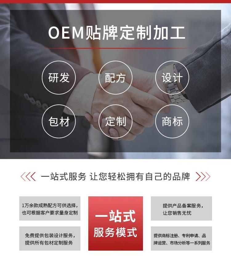 | 補(bǔ)充說(shuō)明 | 貼牌加工種類(lèi): 1、提供樣品,我廠根據(jù)樣品分析、研究、設(shè)計(jì)配方,客戶(hù)確定后在按照全單方式委托我廠。 2、委托加工:我廠根據(jù)客戶(hù)要求進(jìn)行產(chǎn)品配方設(shè)計(jì),研發(fā)生產(chǎn),客戶(hù)確定后在委托我廠進(jìn)行加工、生產(chǎn)。 3、來(lái)料加工:客戶(hù)提供原材料和包材、我廠提供設(shè)備、生產(chǎn)場(chǎng)地可人員,一句客戶(hù)要求進(jìn)行加工、生產(chǎn)。 4、OBM模式:我們自行創(chuàng)立產(chǎn)品品牌,生產(chǎn)銷(xiāo)售擁有自主品牌的產(chǎn)品。 |