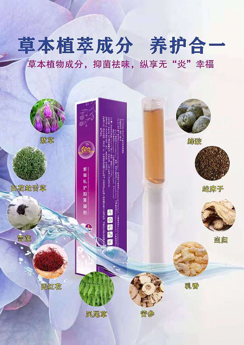 | 主要成分 | 紫草提取物(LithospermumerythrorhizonSieb.etZucc.)、白花蛇舌草提取物(Oldenlandiadiffusa(Willd.)Roxb.)、雪蓮提取物(Echeverialaui Moran& Meyrán)、鳳尾草提取物(PterismultifidaPoir.)、蜂膠、蛇床子提取物(Cnidiummonnieri(L.)Cuss)、苦參提取物(RadixSophoraeFlavescentis)、乳香提取物(Boswelliacarteri)、西紅花提取物(Crocussativus)、當歸提取物(RadixAngelicaeSinensis)、冰片(Borneolum)。 |