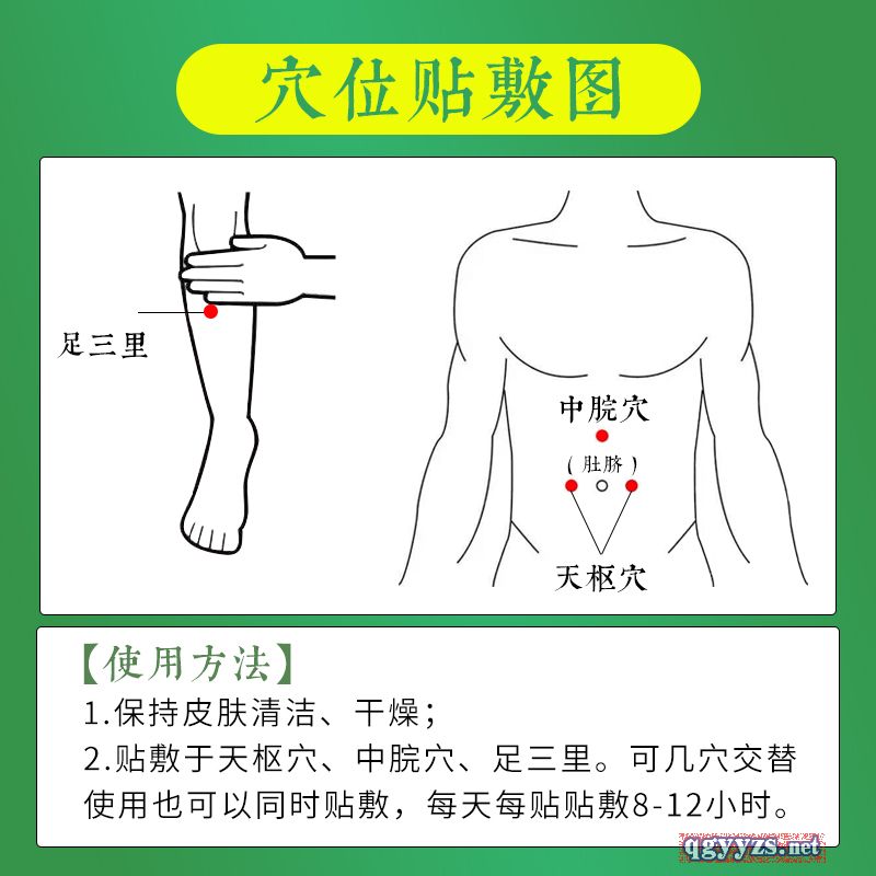 | 使用方法 | 【使用方法】 1.保持皮膚清潔、干燥; 2.貼敷于天樞穴、中院穴、足三里?蓭籽ń惶媸褂靡部梢酝瑫r貼敷,每天每貼貼敷8-12小時。 |