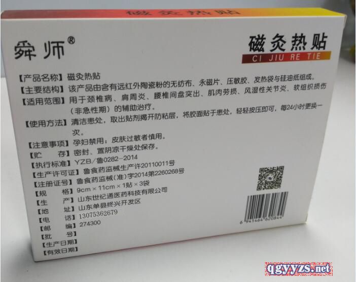 | 使用方法 | 使用方法確認包裝無破損后,清潔患處,打開包裝,取出灸熱治療貼,將貼劑的隔離膜撕去,貼于阿是穴,每24小時更換一次。 |