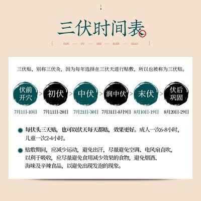 | 產(chǎn)品用途 | 每伏頭三天貼,也可以伏天每天都貼,效果更好。成人一次6-8小時,兒童一次2-4小時。貼敷期間,應減少運動,避免出汗,盡量避免空調(diào)、電風扇直吹,以利于吸收,應盡量避免食用減少效果的食物,避免煙酒、海味及辛辣食品,以避免出現(xiàn)發(fā)泡的現(xiàn)象。 |