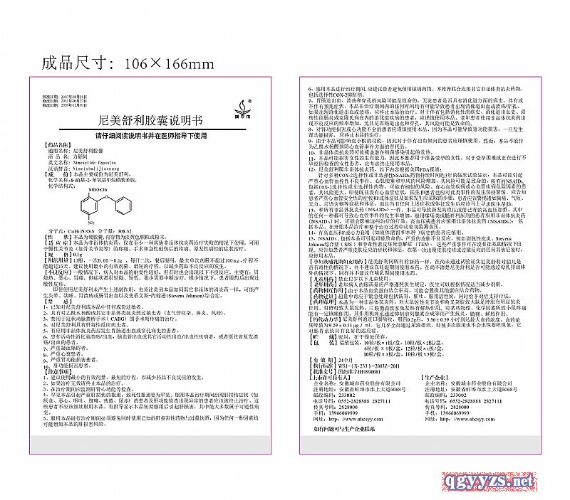 本品主要成份為尼美舒利;瘜W(xué)名稱:4-硝基-2-笨氧基甲烷磺酰苯胺。 |