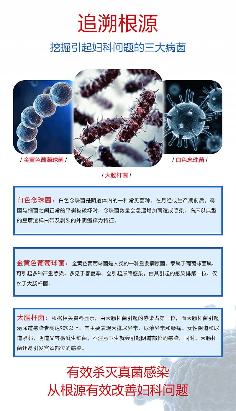 | 產(chǎn)品用途 | 本對(duì)于細(xì)菌、病毒具有強(qiáng)力的抑制作用,適用于各類致病微生物引起**癥狀表現(xiàn)的婦科炎癥和陰道感染, 包括:霉菌性(念珠菌)陰道炎、滴蟲性陰道炎、細(xì)菌性陰道炎、淋菌性陰道炎、子宮內(nèi)膜炎、盆腔炎、陰道混合感染等 多種陰道炎、內(nèi)陰瘙癢、宮頸糜爛、腥臭異味、白帶增多等婦科常見病。 |