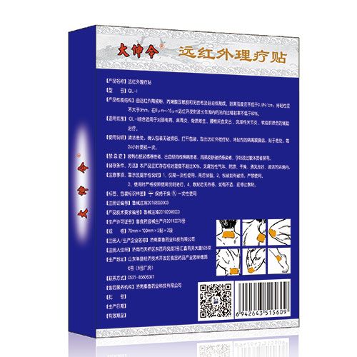 | 使用方法 | 清潔患處,確認(rèn)包裝無(wú)破損后,打開(kāi)包裝,取出遠(yuǎn)紅外理療貼,將貼劑的隔離膜撕去,貼于患處,每24小時(shí)更換一次。 |