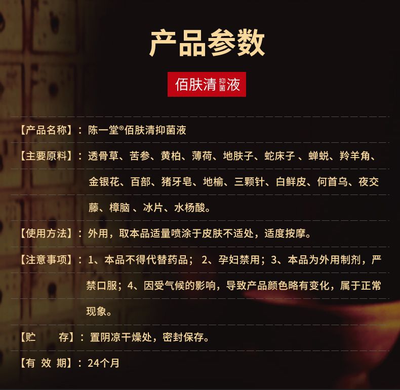 | 產(chǎn)品名稱 | 陳一堂佰膚清抑菌液 |