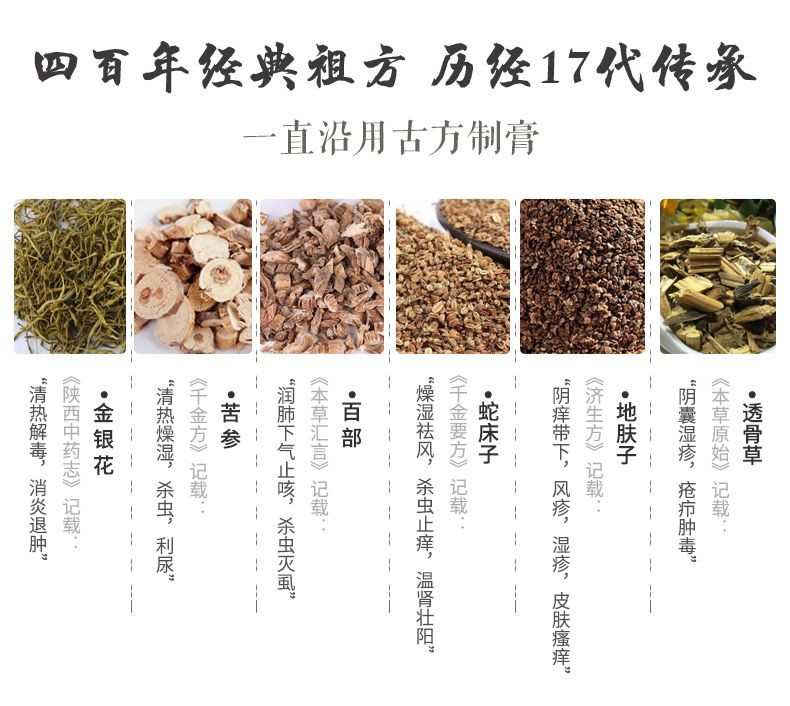 | 主要成分 | 透骨草、苦參、黃柏、薄荷、地膚子、蛇床子、蟬蛻、羚羊角、金銀花、百部、豬牙皂、地榆、三顆針、白鮮皮、何首烏、夜交藤、樟腦、冰片、水楊酸。 |