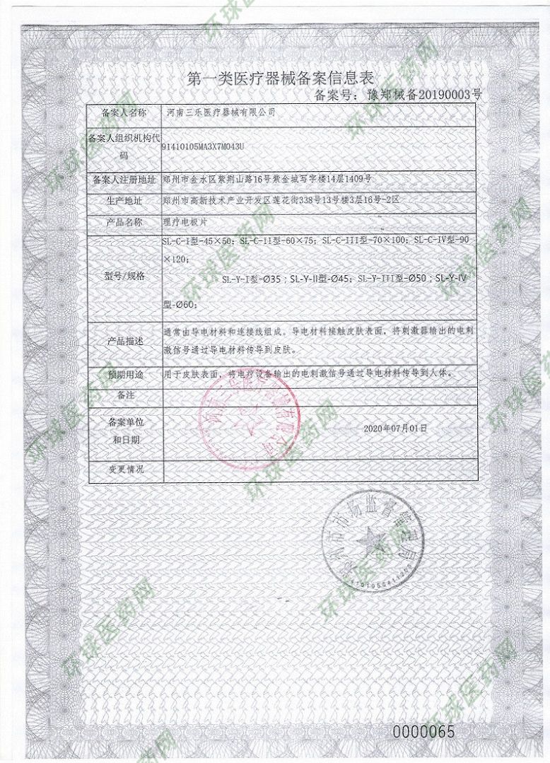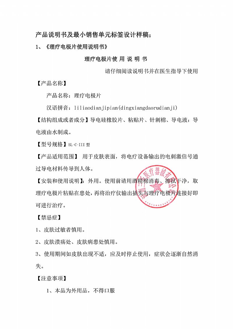 | 補(bǔ)充說明 | 適用范圍/預(yù)期用途:用于皮膚表面,將電療設(shè)備輸出的電刺激信號通過導(dǎo)電材料傳導(dǎo)到人體。可結(jié)合電腦中頻治療儀,低頻治療儀,等電療設(shè)備使用 禁忌癥 1、皮膚過敏者慎用。 2、皮膚潰瘍處、皮膚病患處慎用。 3、使用期間如皮膚出現(xiàn)不適,應(yīng)及時停止使用,癥狀會逐漸自然消失 注意事項(xiàng) 1、本品為外用品,不得口服 2、本產(chǎn)品一次性使用, 不得交叉、重復(fù)使用,請?jiān)诒Y|(zhì)期內(nèi)使用,包裝破損時請不要使用。 3、使用時偶有過敏現(xiàn)象發(fā)生,如使用部位出現(xiàn)瘙癢皮疹、應(yīng)更換部位,嚴(yán)重者禁止使用。 |