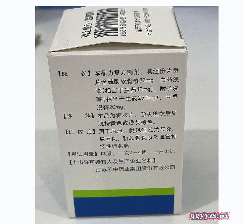 | 主要成分 | 本品為復(fù)方制劑,其組分為每片含硫酸軟骨素75mg、白芍浸膏(相當(dāng)于生藥40mg)、附子浸膏(相當(dāng)于生藥250mg)、甘草浸膏20mg。 |