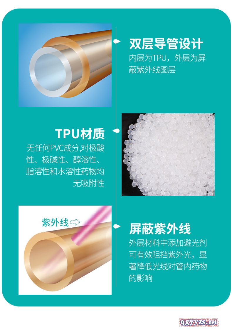 | 產(chǎn)品賣點 | 1、運用先進的雙層導(dǎo)管復(fù)合工藝,內(nèi)層采用FDA推薦的聚氨酯(TPU)材料,不含DEHP,確保輸液**; 2、TPU與藥物相容性好,更具輸液**性;其主要用于制作人工心臟瓣膜、人工肺、人工血管/氣管、骨粘合劑、中心靜脈導(dǎo)管、高端輸液器等; 3、外層為避光層,無避光劑遷移、脫色問題,解決了避光劑遷移對藥液污染的問題; 4、避光率大; 5、管路彈性好,透明度高,易于觀察回血和液面。 |