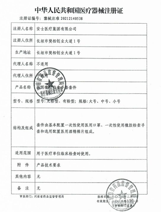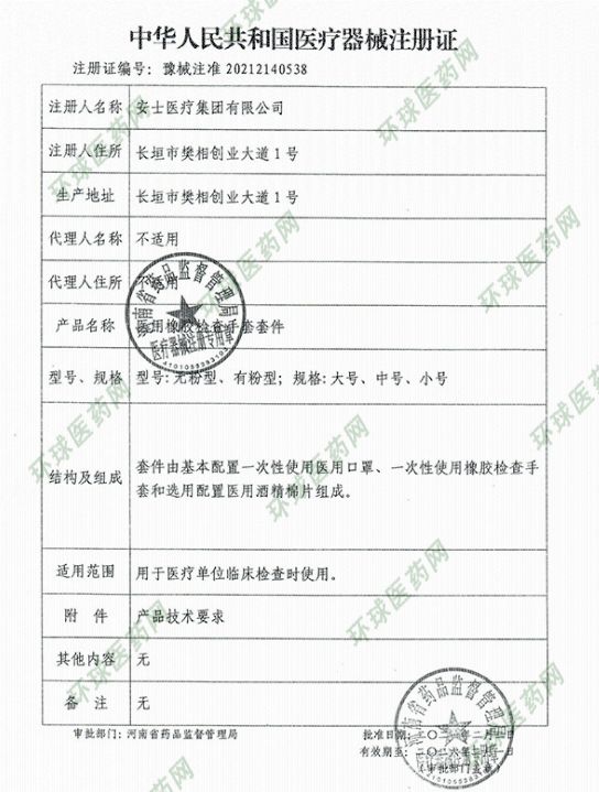 | 補(bǔ)充說明 | 醫(yī)用檢查手套使用說明 名稱:醫(yī)用檢查手套 規(guī)格:大號、中號、小號; 產(chǎn)品描述:有足夠的強(qiáng)度和阻隔性能。非無菌提供,一次性使用。本品采用聚乙烯薄膜熱合制成。 組成:本產(chǎn)品由天然橡膠乳制成。 產(chǎn)品應(yīng)無菌。經(jīng)環(huán)氧乙烷滅菌后,環(huán)氧乙烷殘留量應(yīng)不大于10μg/g。 一次性使用。 范圍:防止病人和使用者之間的交叉感染。 適用范圍:用于戴在醫(yī)生手上對患者病情進(jìn)行檢查或觸檢。 包裝:紙塑袋、塑料袋 包裝:滅菌 組成:本產(chǎn)品由醫(yī)用橡膠塑模而成。 生產(chǎn)單位:安士醫(yī)療集團(tuán)有限公司 生產(chǎn)地址:河南省長垣縣樊相創(chuàng)業(yè)大道1號 |