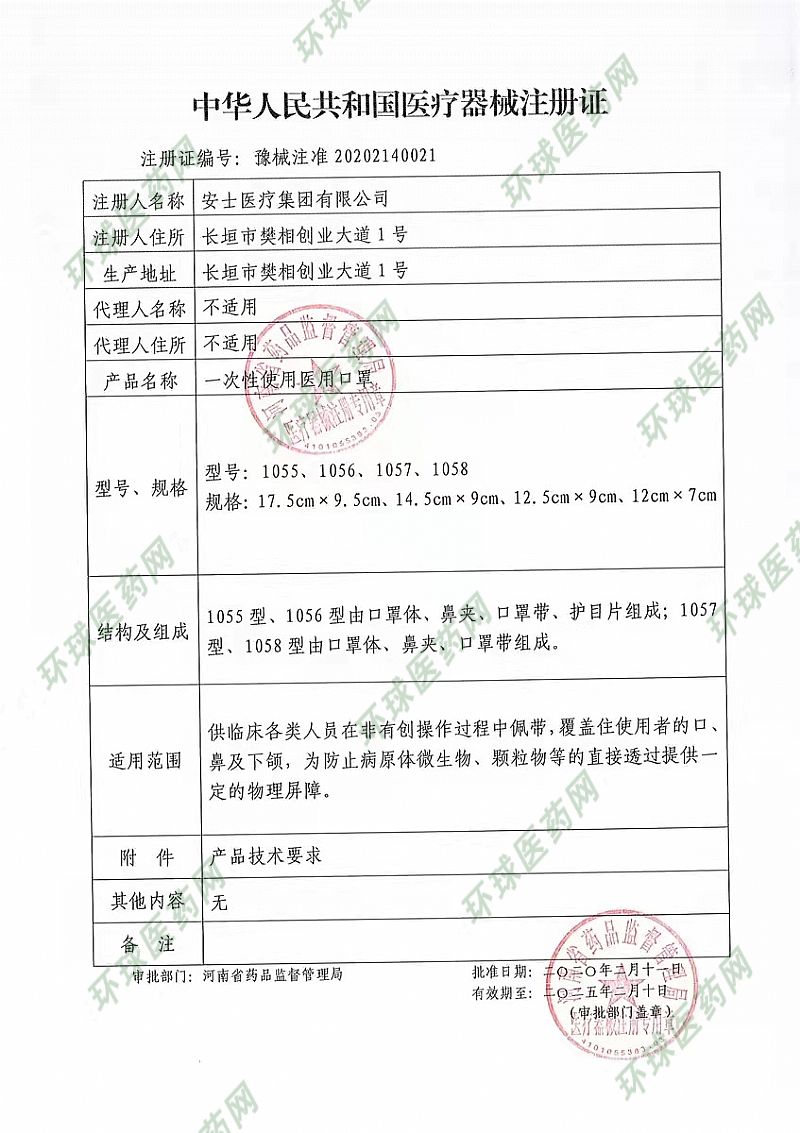 | 其它說明 | 一次性使用普通醫(yī)用口罩(簡稱一次性口罩)使用說明 名稱:一次性使用普通醫(yī)用口罩(簡稱一次性口罩) 型號: 平面耳掛式、平面綁帶式 組成: 本產(chǎn)品由非織造布、高效過濾紙加工制成。產(chǎn)品應(yīng)無菌。經(jīng)環(huán)氧乙烷滅菌后,環(huán)氧乙烷殘留量應(yīng)不大于10μg/g。 一次性使用。 適用: 供臨床醫(yī)務(wù)人員在有創(chuàng)操作過程中佩戴,覆蓋住使用者的口、鼻及下顎,為防止病原體微生物、體液、顆粒物等的直接透過提供物理屏障。 組成: 本產(chǎn)品由醫(yī)用無紡布、熔噴布、耳帶、鼻梁條組成。 產(chǎn)品應(yīng)無菌。經(jīng)環(huán)氧乙烷滅菌后,環(huán)氧乙烷殘留量應(yīng)不大于10μg/g。 一次性使用。 適用: 供臨床醫(yī)務(wù)人員在有創(chuàng)操作過程中佩戴,覆蓋住使用者的口、鼻及下顎,為防止病原體微生物、體液、顆粒物等的直接透過提供物理屏障。 貯存:應(yīng)貯存于通風(fēng)干燥、**氣體的室內(nèi),遠(yuǎn)離火源,且**通風(fēng)良好,無腐蝕性氣體、相對濕度不超過80%的室內(nèi)。 生產(chǎn)單位:安士醫(yī)療集團(tuán)有限公司 生產(chǎn)地址:河南省長垣縣樊相創(chuàng)業(yè)大道1號工業(yè)園區(qū) |