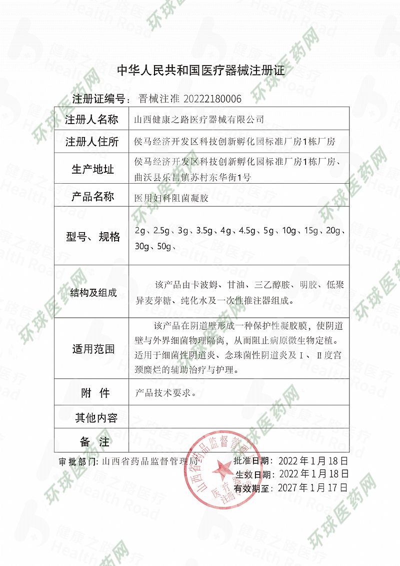 | 補充說明 | 【產(chǎn)品名稱】醫(yī)用婦科阻菌凝膠 【型號規(guī)格】2g、2.5 g、3g、3.5g、4g、4.5g、5g、10g、15g、20g、30g、50g 【結(jié)構(gòu)組成】該產(chǎn)品由卡波姆、甘油、三乙醇胺、明膠、低聚異麥芽糖、純化水及一次性推注器組成。 【產(chǎn)品性能】PH 3.5-6.5;微生物限度:需氧菌總數(shù)(cfu/g)≤102,霉菌和酵母菌總數(shù)(cfu/g)≤101,白色念珠菌(1g)不得檢出,金黃色葡萄球菌(1g)不得檢出,銅綠假單胞菌(1g)不得檢出。 【適應范圍】該產(chǎn)品在陰道壁形成一種保護性凝膠膜,使陰道壁與外界細菌物理隔離,從而阻止病原微生物定植。適用于細菌性陰道炎,念珠菌性陰道炎及Ⅰ、Ⅱ度宮頸糜爛的輔助治療與護理。 【使用方法】 1、打開內(nèi)包裝,取出一次性推注器。 2、去除推注器一端保護帽,自然平臥位,將給藥器插入陰道,使凝膠推送至患病部位。 3、抽出推注器,棄之。每日一只,宜睡前使用。7天為一療程。 【禁忌癥】對本品任何成分過敏者禁用。處女禁用。經(jīng)期禁深部用藥。孕婦禁用。 【注意事項】 1、本品外用凝膠,禁止口服。 2、本品僅一次性使用。 3、哺乳期婦女應在醫(yī)師指導下使用。 4、置于兒童不宜拿到處。 5、包裝破損、性狀發(fā)生改變時禁止使用。 6、本品不宜與堿性外用品同時使用,如需使用,需用生理鹽水沖洗后使用。 【有效期】2年 【生產(chǎn)日期/生產(chǎn)批號】 見外包裝 【貯存】密閉、通風、干燥處貯存。 【運輸】產(chǎn)品在運輸過程中應避免日曬、雨淋及重壓。 【配件清單】醫(yī)用婦科阻菌凝膠、說明書 【生產(chǎn)許可證編號】晉食藥監(jiān)械生產(chǎn)許20200012號 【注冊證編號】晉械注準20222180006 【產(chǎn)品技術要求編號】晉械注準20222180006 【注冊人/生產(chǎn)企業(yè)/售后服務單位】山西健康之路醫(yī)療器械有限公司 |