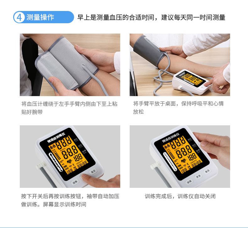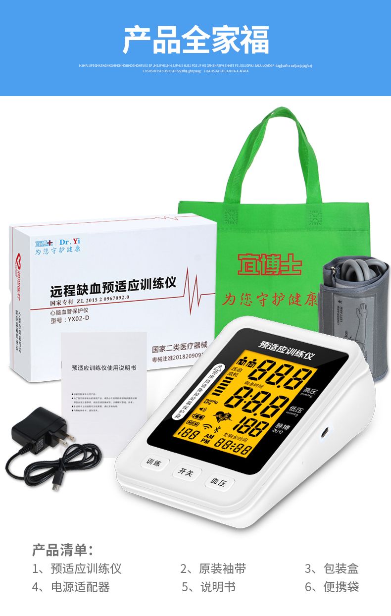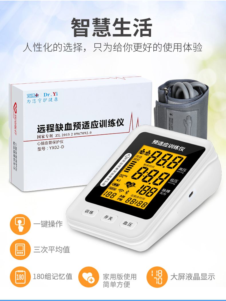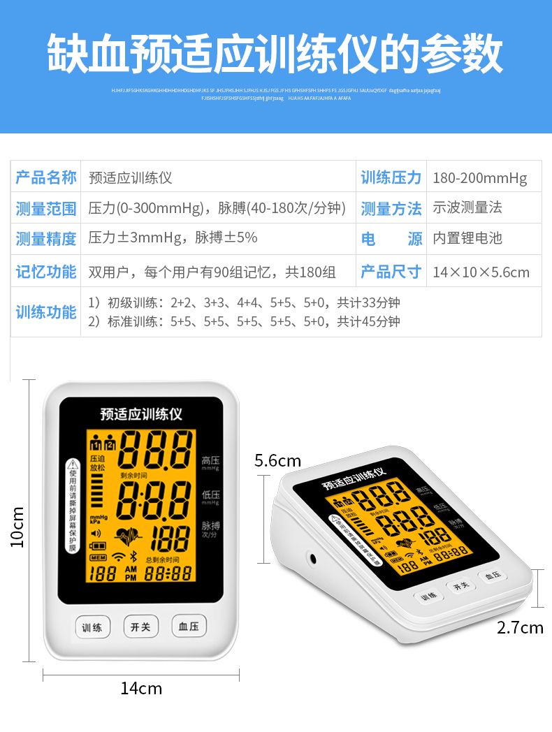 | 產(chǎn)品賣點(diǎn) | 預(yù)適應(yīng)訓(xùn)練儀好處:一次預(yù)適應(yīng)訓(xùn)練相當(dāng)于跑5000米血液循環(huán)運(yùn)動量; ①改善睡眠;②預(yù)防心梗腦梗;③增加血管彈性;④使血管壁光滑;⑤促進(jìn)血液循環(huán);⑥調(diào)整血壓 產(chǎn)品優(yōu)勢:①一鍵操作智能測壓;②醫(yī)用標(biāo)準(zhǔn)語音播報;③超薄設(shè)計專利產(chǎn)品;④內(nèi)置鋰電環(huán)保節(jié)能;⑤高清屏顯;⑥兩用,可測量可訓(xùn)練保健康! |