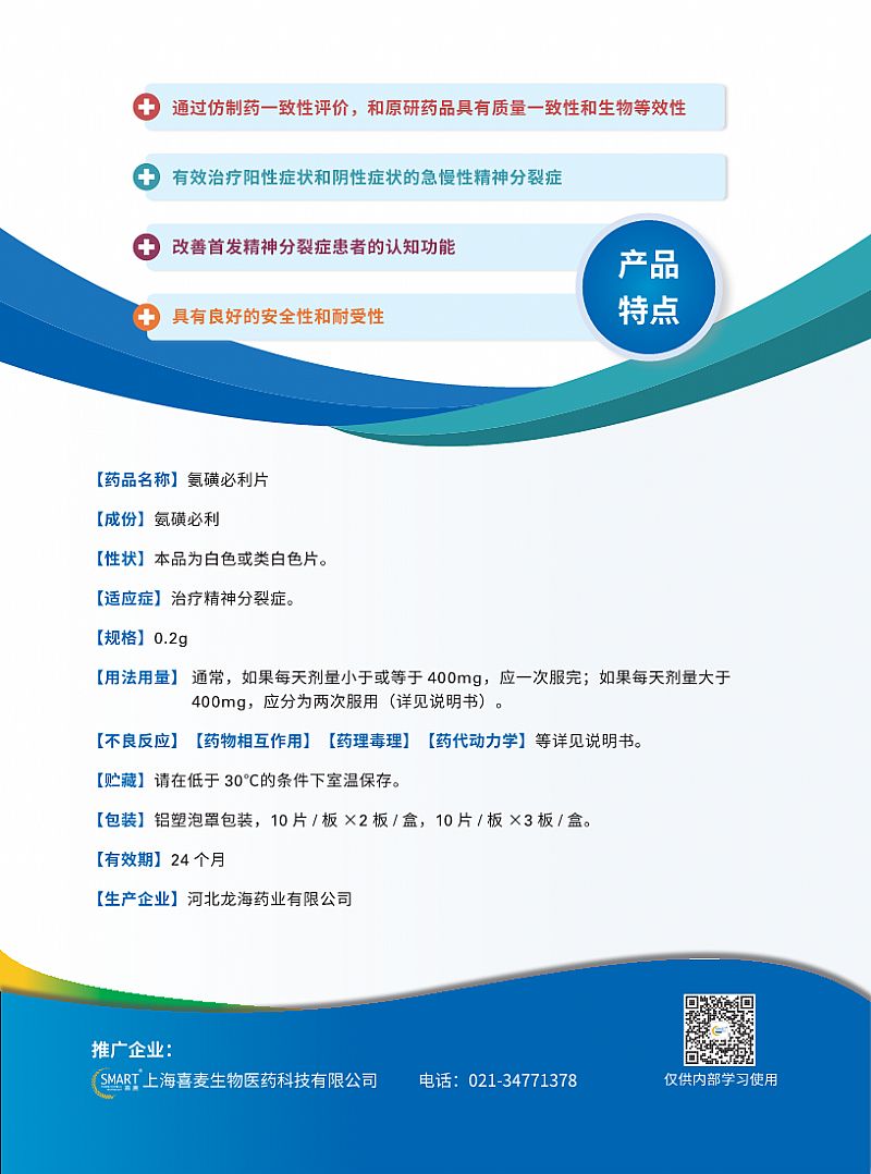 【功能主治】氨磺必利用來(lái)治療精神疾患,尤其是伴有陽(yáng)性癥狀(例如:譫妄,幻覺(jué),認(rèn)知障礙)和/或陰性癥狀(例如:反應(yīng)遲緩,情感淡漠及社會(huì)能力退縮)的急性或慢性精神分裂癥,也包括以陰性癥狀為主的精神病患。