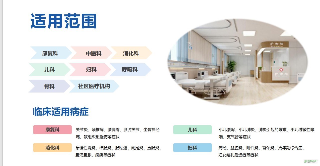 | 產(chǎn)品用途 | 適用范圍:康復(fù),中醫(yī),消化,兒科,婦科,呼吸科,骨科,社區(qū)醫(yī)療機(jī)構(gòu) |