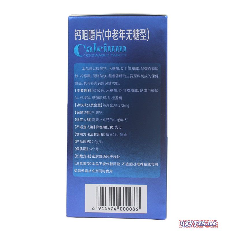 | 主要成分 | 鈣咀嚼片(中老年無糖型) 為中老年人補充鈣,糖尿病人可服用。 本品是以碳酸鈣、木糖醇、D-甘露糖醇、酪蛋白磷酸肽、檸檬酸、硬脂酸鎂、甜橙香精為主要原料制成的保健食品,具有補充鈣的保健功能。 【主要原料】碳酸鈣、木糖醇、D-甘露糖醇、酪蛋白磷酸肽、檸檬酸、硬脂酸鎂、甜橙香精 【功效成分及含量】每片含:鈣372mg 【保健功能】補充鈣 【適宜人群】需要補充鈣的中老年人 【不適宜人群】孕晚期婦女、乳母 【食用方法及食用量】每日1片,嚼食 【產(chǎn)品規(guī)格】2.0g/片*60片/盒 【保質(zhì)期】24個月 【貯藏方法】密封置通風(fēng)干燥處 |