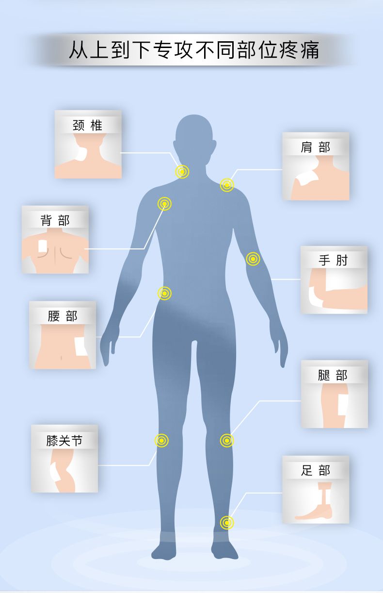| 產(chǎn)品用途 | 藥物滲透至疼痛處持久發(fā)揮藥效、促進血液循環(huán)緩解疼痛、修護受傷組織、舒緩炎癥 |
