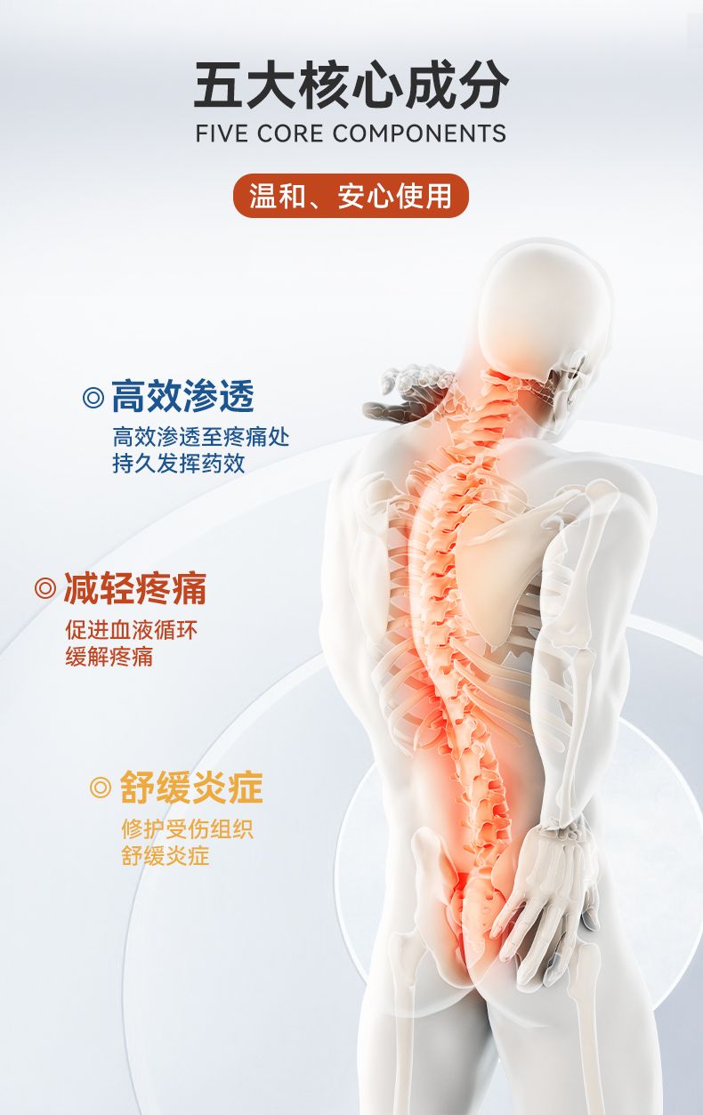 | 作用機理 | 藥物滲透至疼痛處持久發(fā)揮藥效、促進血液循環(huán)緩解疼痛、修護受傷組織、舒緩炎癥 |