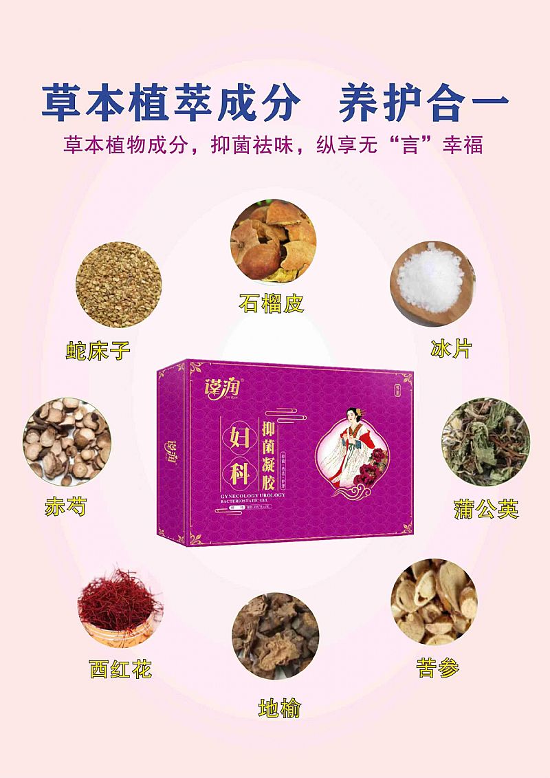 | 主要成分 | 苦參(RadixSophoraeFiavescentis)、蛇床子(FructusCnidii)、西紅花(StigmaCroci)、石榴皮(PericarpiumGranati)、蒲公英(HerbaTaraxaci)、地榆(RadixSanguisorbae)、赤芍(RadixPaeoniaeRubra)、黃柏(CortexPhellodendriChinsis)、乳香(Olibanum)、金銀花(FlosLoniceraeJaponicae)、冰片 |