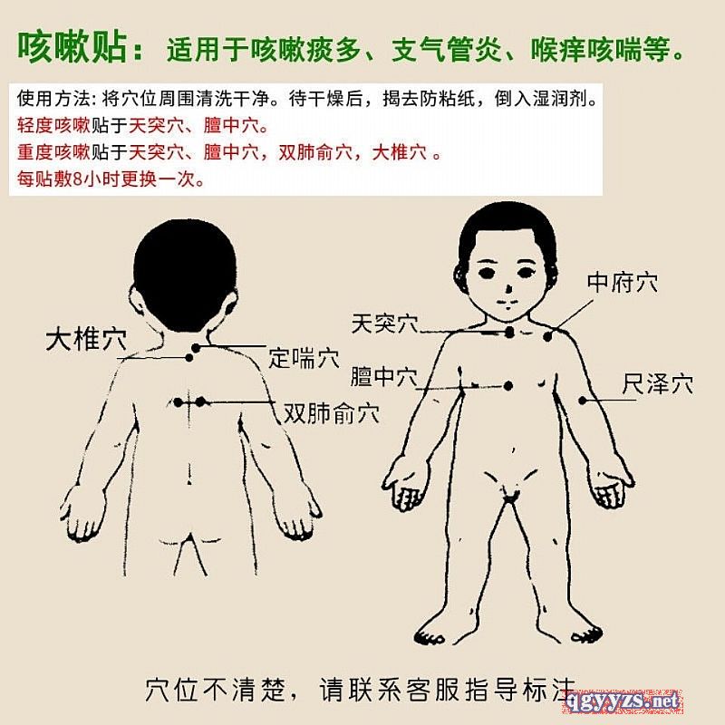 | 使用方法 | 將穴位周圍清洗干凈。待干燥后,揭去本品防粘紙,貼于天突穴、檀中穴、雙肺俞穴、大椎穴。每貼敷6-8小時更換一次。 |
