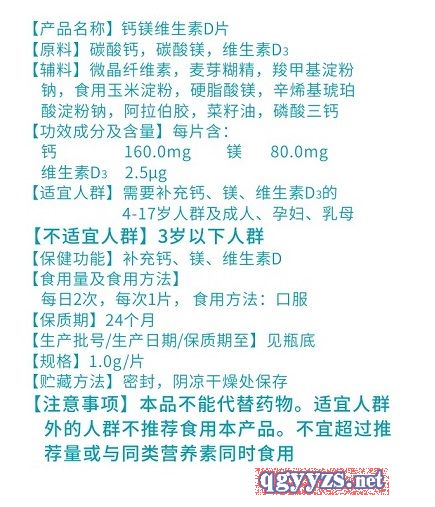 | 作用機理 | 【適宜人群】需要補充鈣、鎂、維生素D3的4-17歲人群及成人、孕婦、乳母 【不適宜人群】3歲以下人群 【保健功能】補充鈣、鎂、維生素D |