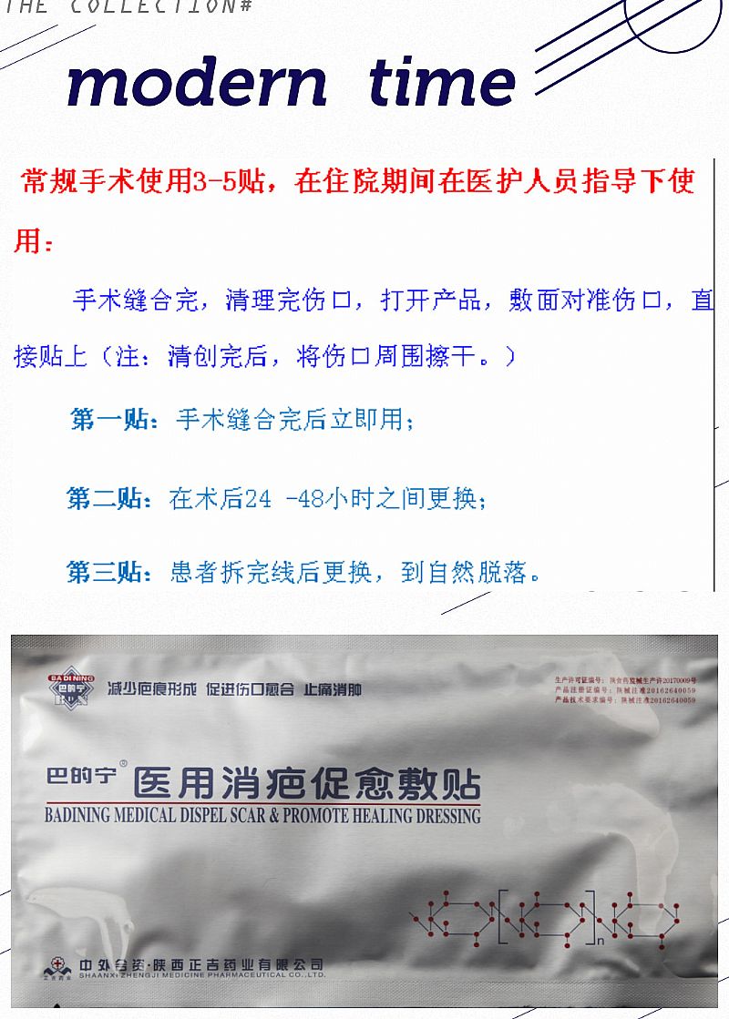 | 產(chǎn)品用途 | 該產(chǎn)品為醫(yī)用敷料。對(duì)促進(jìn)傷口愈合、止痛、消腫、減少疤痕的形成有一定作用。 |