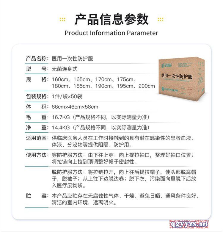| 補充說明 | 1、本產品為無菌、一次性使用產品,有效期三年; 2、本產品只限于一次性使用,打開包裝后應立即使用,使用時間不超過24小時,用后應焚燒處理; 3、穿著前如發(fā)現(xiàn)破損或拉鏈、縫線等任何部位有不妥之處,則不可使用; 4、防護服應避免長時間與化學物質接觸。 5、本產品無阻燃性。 |
