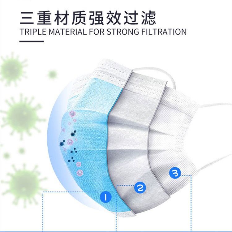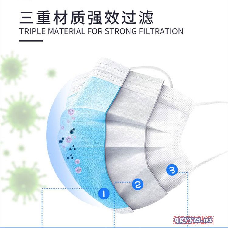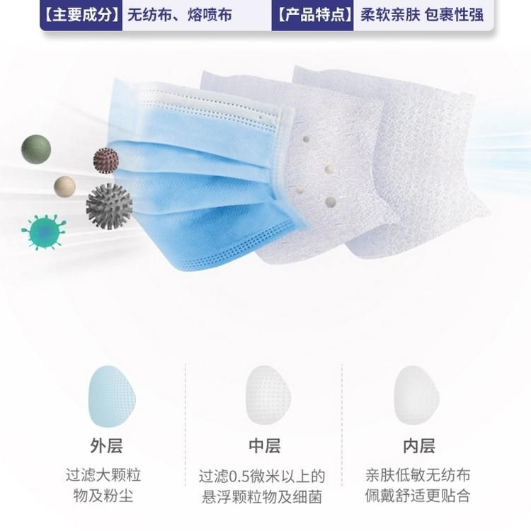 | 主要成分 | 由表層、中間層、底層、口罩帶、鼻夾組成。表層材料為聚丙烯紡粘布、中間層材料為聚丙烯噴絲法制成的過濾熔噴布、底層材料為聚丙烯紡粘布、口罩帶為滌綸線和少量氨綸線針織而成、鼻夾為可彎折可定型的聚丙烯制成。 |