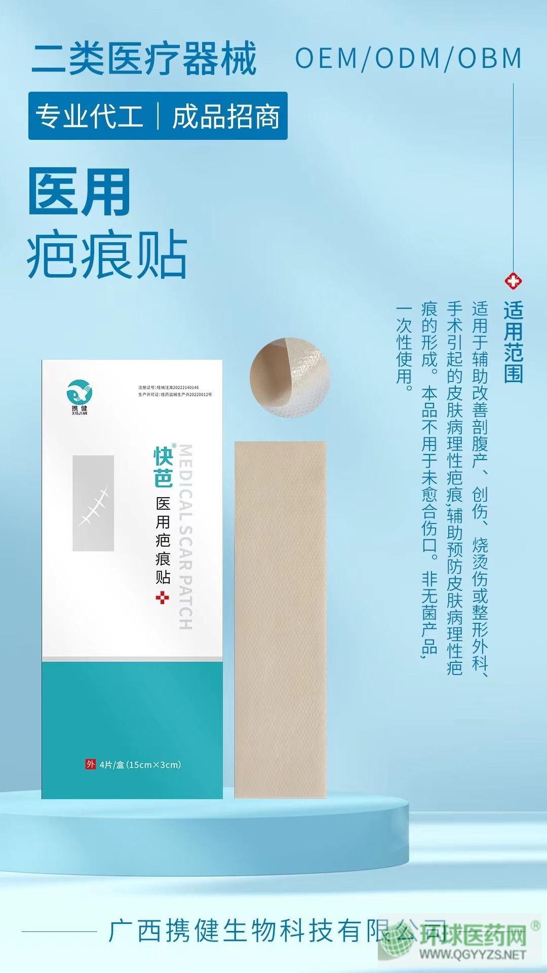 | 產(chǎn)品用途 | 適用于抑制體表外傷、燒傷、手術(shù)原因引起的增生性疤痕。用于輔助改善皮膚病理性疤痕,輔助預(yù)防皮膚病理性疤痕的形成,不用于未愈合的傷口。非無菌提供。 |