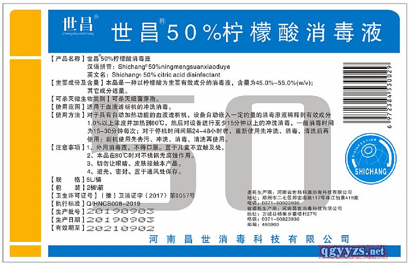 產(chǎn)品名稱(chēng): 世昌®;50%檸檬酸消毒液