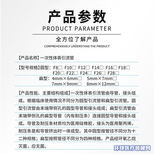| 補(bǔ)充說明 | 【型號(hào)規(guī)格】圓型:F8、F10、F12、F14、F16、F18、F20、F22、F24、F26、F28 扁型:4mm×6mm、5mm×7mml、7mm×9mm、8mm×12mm 【結(jié)構(gòu)組成】一次性體表引流管由導(dǎo)管、接頭組成。產(chǎn)品經(jīng)環(huán)氧乙烷滅菌,應(yīng)無菌。 【產(chǎn)品型號(hào)及結(jié)構(gòu)】根據(jù)臨床使用情況不同分為:圓型引流管、扁型引流管 (1)圓型引流管由末端帶側(cè)孔的圓型導(dǎo)管和接頭組成; (2)扁型引流管由末端帶側(cè)孔的扁型導(dǎo)管(內(nèi)有耐壓條)連接圓型導(dǎo)管和接頭組成。 【原材料】導(dǎo)管及耐壓條材質(zhì)均為醫(yī)用硅橡膠,接頭為醫(yī)用聚丙烯,耐壓條是和導(dǎo)管擠出時(shí)一體成型。其中圓型按管徑不同分為十二種規(guī)格;扁型按照管徑不同分為四種規(guī)格 【產(chǎn)品特點(diǎn)】1、耐彎曲耐負(fù)壓。管體不打折,通氣順暢,管體不扁癟 2、配備通用接頭。通用接頭,適合市場上大部分負(fù)壓球 【使用時(shí)間】*長留置時(shí)間不超過24小時(shí) 【有效期】2年 |