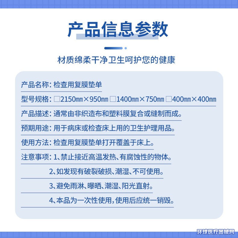 | 補(bǔ)充說(shuō)明 | 【型號(hào)規(guī)格】長(zhǎng)(10~400)×寬(10~3000)單位(cm) 【產(chǎn)品描述】通常由非織造布和防水PE膜復(fù)合或縫制而成。非無(wú)菌提供,一次性使用。 【預(yù)期用途】用于病床或檢查床上用的衛(wèi)生護(hù)理用品 【產(chǎn)品細(xì)節(jié)】1、單張折疊,使用便捷,用完丟棄2、使用防水PE底面,有效防止液體滲漏,保持床褥干燥潔凈3、高級(jí)無(wú)紡布表層,觸感綿柔不刺激 【使用方法】檢查用復(fù)膜墊單打開(kāi)覆蓋于床上 【注意事項(xiàng)】1.禁止接近高溫發(fā)熱、有腐蝕性的物體;2、如發(fā)現(xiàn)有破裂破損、潮濕、不可使用;3、避免雨淋、曝曬、潮濕、陽(yáng)光直射;4、本品為一次性使用,使用后應(yīng)統(tǒng)一銷(xiāo)毀 |