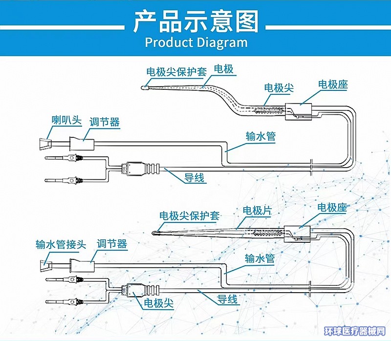 | 補(bǔ)充說明 | 【產(chǎn)品結(jié)構(gòu)組成及性能】消融電極由電極片、電極座、導(dǎo)線、插頭、輸水管、調(diào)節(jié)器、輸水管接頭、限位塊和電極尖保護(hù)套組成,其中輸水管和調(diào)節(jié)器為可選配部件。產(chǎn)品出水方式為雙側(cè)滴水。產(chǎn)品應(yīng)無菌。 【適用范圍】消融電極與高頻儀器配套使用,供臨床各類外科手術(shù)非內(nèi)窺鏡下對(duì)組織進(jìn)行電切、電凝、消融,達(dá)到止血的目的。 【使用說明】 1、根據(jù)臨床需要,選擇相應(yīng)規(guī)格型號(hào)的消融電極產(chǎn)品; 2、取出無菌小包裝,從啟口處撕開,取出,脫去護(hù)套,順理、將輸水管與生理鹽水瓶有效連接,用專用連接線接通高頻機(jī)電源,調(diào)節(jié)輸水流量調(diào)節(jié)器,放水1分鐘,進(jìn)入正常使用狀態(tài)待用;手術(shù)過程中應(yīng)及時(shí)用紗布抹去鑷尖上的組織附著物,確保滴水口暢通; 3、整個(gè)手術(shù)過程中,應(yīng)嚴(yán)格執(zhí)行無菌操作和相關(guān)操作規(guī)程,并注意觀察病人體征; |