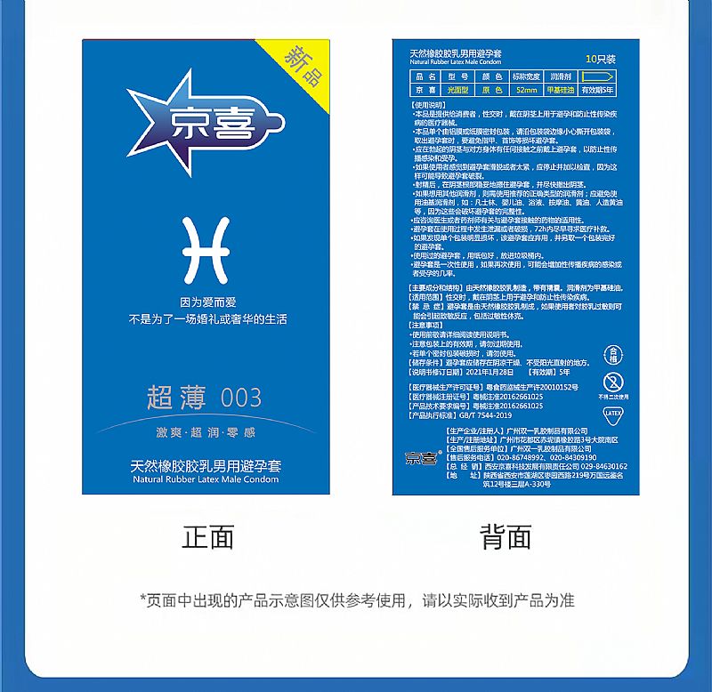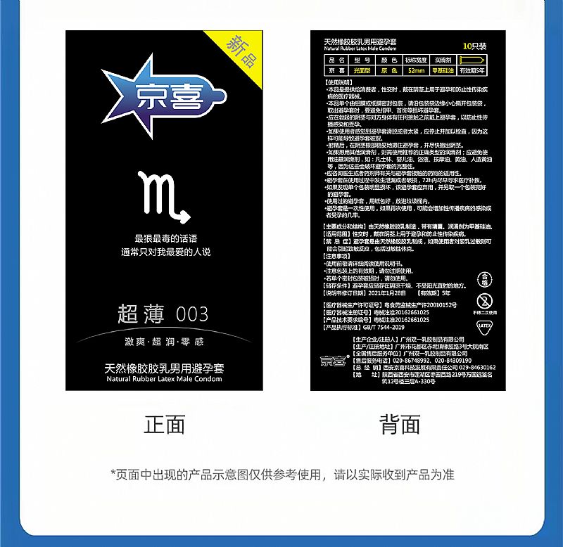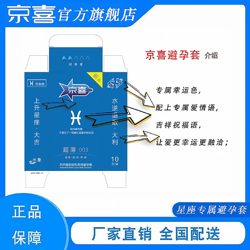 補(bǔ)充說(shuō)明 京喜超薄003星座系列男用避孕套是由京喜科技公司,經(jīng)過(guò)大量的市場(chǎng)調(diào)研精心研發(fā)的一款將避孕套與星座文化緊密而有趣結(jié)合的產(chǎn)品。通過(guò)相關(guān)領(lǐng)域?qū)Σ煌亲膶傩蕴攸c(diǎn)的分析,創(chuàng)造性的設(shè)計(jì)出適合星座的避孕套。不僅能夠讓使用者的安心,還能夠帶來(lái)娛樂(lè)性的體驗(yàn)。這也充分體現(xiàn)了京喜公司的專(zhuān)業(yè)和誠(chéng)意。在產(chǎn)品同質(zhì)化非常嚴(yán)重的今天可以說(shuō)是避孕套行業(yè)的一大亮點(diǎn)。