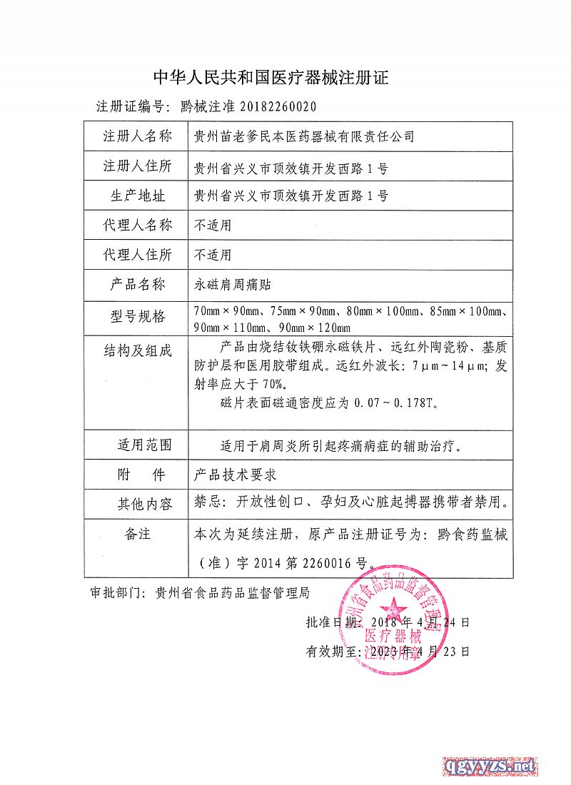 | 補充說明 | 1、使用本品,若個別皮膚出現(xiàn)瘙癢或皮疹,應(yīng)立即停止使用即可。 2、使用或存放本品時應(yīng)遠離磁卡和易受磁損壞物品;不要與帶金屬儀表的器械同時使用。 3、開放性傷口、孕婦、兒童、心臟起搏器攜帶者和對磁療有明顯不良反應(yīng)者禁用。 4、置于干燥通風(fēng)處保存。 【售后服務(wù)單位】貴州苗老爹民本醫(yī)藥器械有限責(zé)任公司 【注冊人住所】貴州省興義市頂效鎮(zhèn)開發(fā)西路1號 |