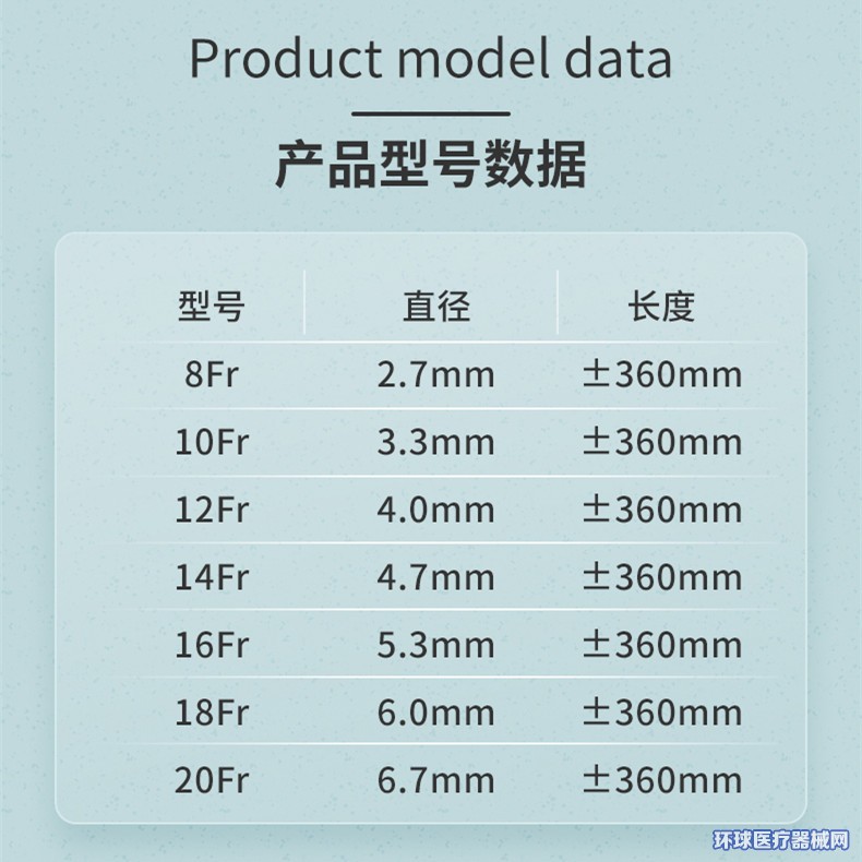 | 產(chǎn)品規(guī)格 | 8Fr、10Fr、12Fr、14Fr、16Fr、18Fr、20Fr |