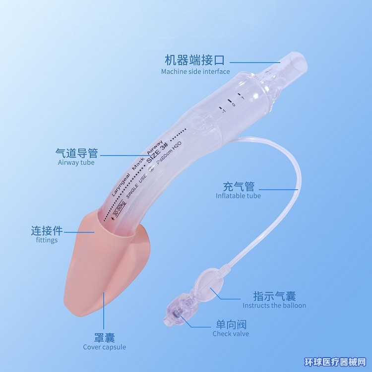 (1)普通型喉罩由罩囊、連接件、氣道導(dǎo)管(單腔通道)、機(jī)器端接口、充氣管、單向閥、指示氣囊組成;