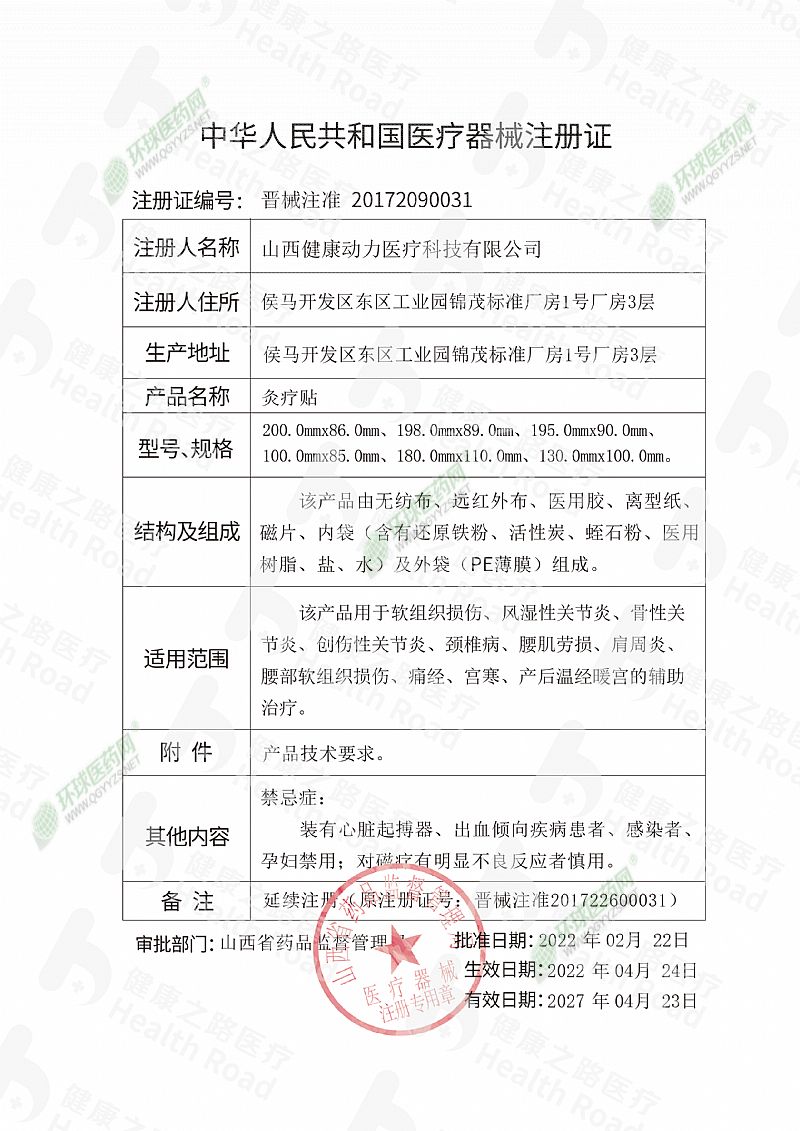 | 補充說明 | 【產(chǎn)品名稱】灸療貼 【型號、規(guī)格】200.0mm×86.0mm、198.0mm×89.0mm、195.0mm×90.0mm、 100.0mm×85.0mm、180.0mm×110.0mm、130.0mm×100.0mm 【結(jié)構(gòu)及組成】該產(chǎn)品由無紡布、遠紅外布、醫(yī)用膠、離型紙、磁片、內(nèi)袋(含有還原鐵粉、活性碳、蛭石粉、醫(yī)用樹脂、鹽、水)及外袋(PE薄膜)組成。 【適用范圍】該產(chǎn)品適用于軟組織損傷、風(fēng)濕性關(guān)節(jié)炎、骨性關(guān)節(jié)炎、創(chuàng)傷性關(guān)節(jié)炎、頸椎病、腰肌勞損、肩周炎、腰部軟組織損傷、痛經(jīng)、宮寒、產(chǎn)后溫經(jīng)暖宮的輔助治療。 【產(chǎn)品性能】遠紅外波長范圍在4μm -16μm之間的法向發(fā)射率不低于0.80。磁場強度為50mT-150mT,持粘性不超過2.5mm,剝離強度應(yīng)不低于1.0N/cm。升溫時間≤20min;溫度**時間≥持續(xù)時間的50%;40℃以上的持續(xù)時間≥4h;*高溫度46℃±5℃。 【使用方法】 使用時,撕開內(nèi)袋,取出灸療貼,展開護翼并揭去內(nèi)側(cè)離型紙,貼在相應(yīng)疼痛部位,輕壓周邊膠布貼實,8-12小時后取下。 【禁 忌 癥】 裝有心臟起搏器、出血傾向疾病患者、感染者、孕婦禁用;對磁療有明顯不良反應(yīng)者慎用。 【注意事項】 1.本品為一次性外用產(chǎn)品,開袋即熱,不使用切勿開袋。 2.對磁場敏感者如產(chǎn)生頭暈、嘔吐等暈磁現(xiàn)象,應(yīng)立即停用,癥狀即可消失。 3.用后患處出現(xiàn)不適或水泡,應(yīng)暫停使用,防止感染,恢復(fù)后可繼續(xù)使用。 4.溫控貼為選用品,初次使用或在新的部位使用本品時,請依照自身對溫度高低的要求,決定是否使用溫控貼。 5.兒童須在成人監(jiān)護下使用。 6.請勿在劇烈運動、睡眠中、取暖設(shè)備前使用,避免低溫燙傷。 7.過敏體質(zhì)慎用。 【儲存方法】應(yīng)貯存在通風(fēng)干燥處,無腐蝕性氣體和通風(fēng)良好的室內(nèi)。 【運輸】產(chǎn)品在運輸過程中應(yīng)避免日曬、雨淋及重壓。 【配件清單】灸療貼、說明書、溫控貼。 【有 效 期】二年 【生產(chǎn)日期/生產(chǎn)批號】見外包裝 【生產(chǎn)許可證編號】晉食藥監(jiān)械生產(chǎn)許20160009號 【注冊證編號】晉械注準(zhǔn)20172090031 【產(chǎn)品技術(shù)要求編號】晉械注準(zhǔn)20172090031 【注冊人名稱/生產(chǎn)企業(yè)】山西健康動力醫(yī)療科技有限公司 |