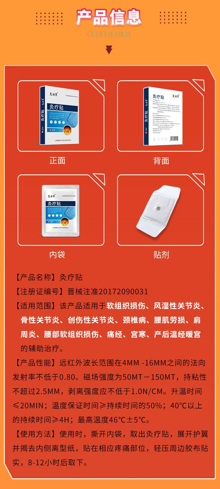 | 產(chǎn)品賣點 | 該產(chǎn)品適用于軟組織損傷、風(fēng)濕性關(guān)節(jié)炎、骨性關(guān)節(jié)炎、創(chuàng)傷性關(guān)節(jié)炎、頸椎病、腰肌勞損、肩周炎、腰部軟組織損傷、痛經(jīng)、宮寒、產(chǎn)后溫經(jīng)暖宮的輔助治療。 控銷;提供驗廠;授權(quán);廣審 |